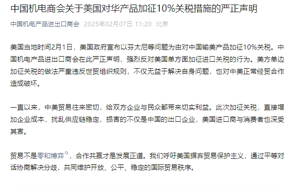 美国当地时间2月1日,美国政府宣布以芬太尼等问题为由对中国输美产品加征10%关税。中国机电产品进出口商会在此严正声明,强烈反对美国单方面加征进口关税的行为。美方单边加征关税的做法严重违反世贸组织规则,不仅无益于解决自身问题,也对中美正常经贸合作造成破坏。