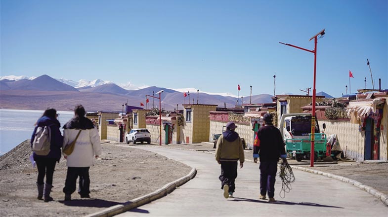 采访结束后,记者与伦珠曲珍一同走出家门。初春的阳光洒在普莫雍措厚实的冰面上,反射出耀眼的光芒。湖畔的村中小路上,村民们三五成群,有说有笑地朝着第二届普莫雍措“蓝冰之约”的开幕现场走去,准备观看演出。“在家能吸氧,出门就能看演出,现在的生活真是太幸福了!”伦珠曲珍脸上洋溢着幸福的笑容。
