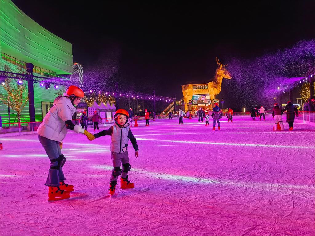 新华社上海2月14日电(记者陈爱平)在上海徐汇滨江,“乐滑之梦”和西岸梦中心联手打造的户外水岸冰场热闹非凡。伴随节奏感强的音乐和灵动灯光,上海市民周雄和儿子手牵手,在冰面上练习滑行。