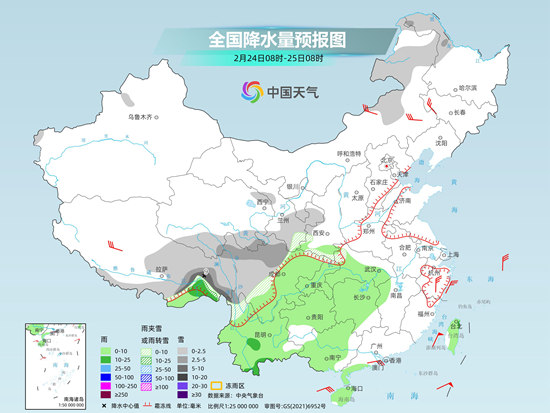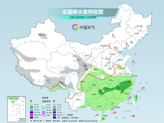 今年2月中旬,西南地区到江南等地降水频繁,降水日数较常年同期偏多2至4天。昨天进入2月下旬,南方降雨暂时减少、减弱,以小雨为主,部分地区中雨;西北地区东部、西藏等地出现降雪。监测显示,21日,西藏东部、四川西北部、青海南部、甘肃东部、山西中北部、河北南部、山东北部、河南东部等地出现小雪或雨夹雪天气,甘肃定西局地中雪。湖南中北部、江西北部、四川东部、贵州南部、云南东南部、浙江中部、台湾岛北部等地出现中到大雨,海南三沙、台湾新北和宜兰局地暴雨。