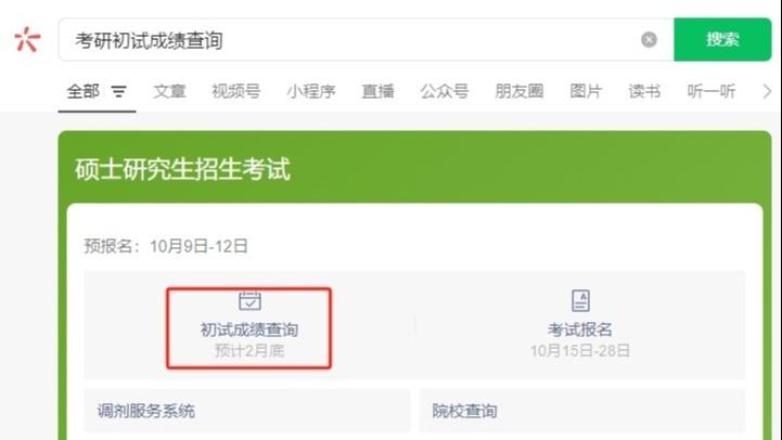 在微信中搜索“考研初试成绩查询”,点击“初试成绩查询”,根据页面提示进行初试成绩查询即可。