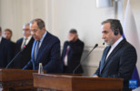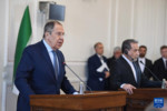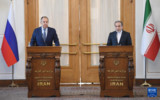 2月25日,在伊朗德黑兰,俄罗斯外长拉夫罗夫(左)与伊朗外交部长阿拉格齐出席联合新闻发布会。新华社记者 沙达提 摄