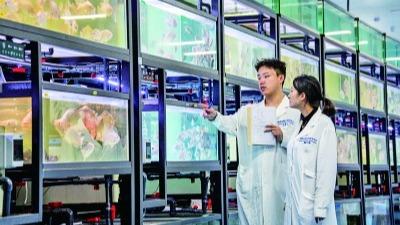 在西部(重庆)科学城种质创制大科学中心养殖室,研究人员观察记录新品种罗非鱼的生长情况。新华社发