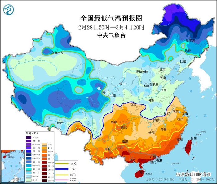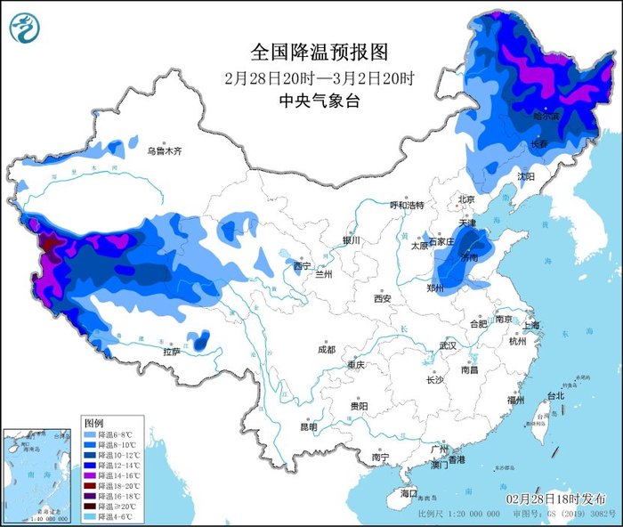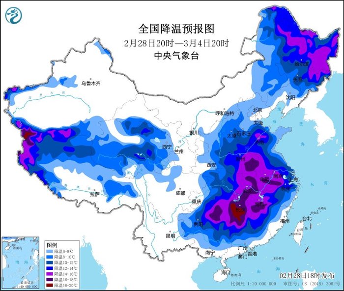 受寒潮影响,预计,2月28日夜间至3月4日,我国中东部气温将自北向南先后下降6~10℃,其中,东北地区北部、华北南部及其以南的大部地区降温12~16℃,部分地区降温18℃以上;4日早晨,最低气温0℃线将南压到江汉至沿淮河一带。另外,青藏高原北部和西部有6~10℃的降温,昆仑山部分地区降温12~14℃,局地降温16℃以上。