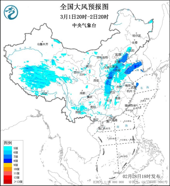 预计,3月1日20时至2日20时,东北地区南部、华北南部、黄淮、江淮北部、江汉以及云南东部、西藏中北部、青海南部等地有4~6级风,阵风7~8级,其中,山东西部、河南中东部、河北南部、西藏中北部等地的部分地区有6~7级风,阵风9级左右。渤海、黄海中部海域、东海西北部的部分海域将有7~8级、阵风9级的大风。