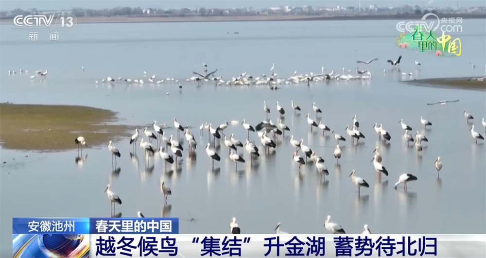 在安徽池州升金湖国家级自然保护区,眼下,数万只候鸟集结,抓紧时间觅食储备能量,为即将到来的北归迁徙做准备。