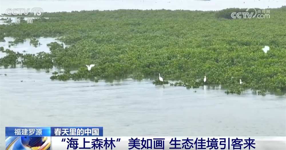 三月春暖,花开树绿。在福建福州罗源县的北山红树林海岸公园,500多亩的红树林沿着海岸线绵延不绝。涨潮时,潮水漫过红树林的根系,树冠如同漂浮在水面上的绿色岛屿。成群的水鸟在树梢间翩跹起舞,时而低飞掠过水面,时而停驻枝头,为这片“海上森林”增添了几分灵动与生机。