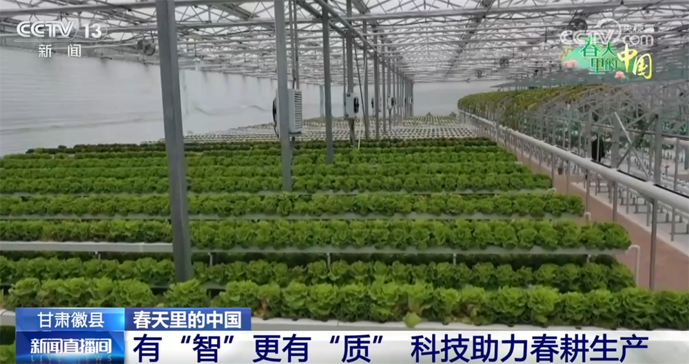 除了大田里,温室中的科技助力也随处可见。在徽县泥阳镇一家现代农业产业园的智能温室里,生菜、西红柿、芹菜等蔬菜长势良好。温室内的智能传感系统对蔬菜的生长、病虫害发生等情况实时动态监测,实现了立体无土栽培。