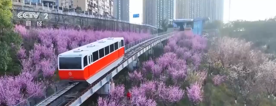 眼下很多地方已是春色满园。在重庆市礼嘉智慧公园内,“时光缆车”穿梭在一片粉色花海中。缆车的轨道建在一片梅林之上,游客乘车驶出站台后,不仅可以欣赏盛开的梅花,还可以远眺嘉陵江的壮丽景色。红白相间的缆车就像穿梭于粉色云霞间的时光机,带游客穿越春色,记录美好。