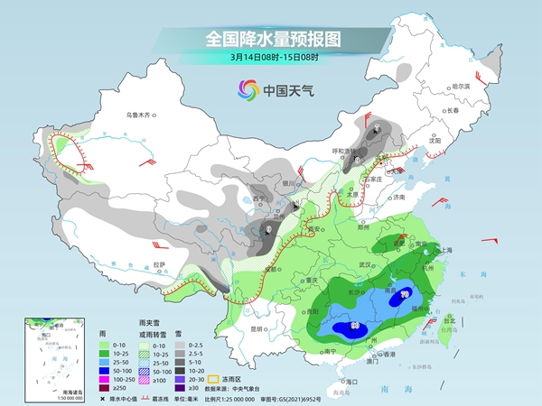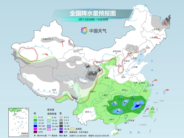 今起至周末,南方将有大范围降雨天气,江南、华南部分地区雨势较强,或现暴雨,上述地区局地伴有短时强降水、雷暴大风等强对流天气。此外,今天黑龙江、内蒙古东部多地仍有降雪,需警惕积雪和道路结冰对交通的不利影响。