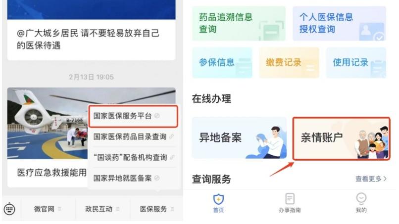 第一步:关注“国家医保局”微信公众号,点击医保服务→国家医保服务平台,进入“亲情账户”操作页面。