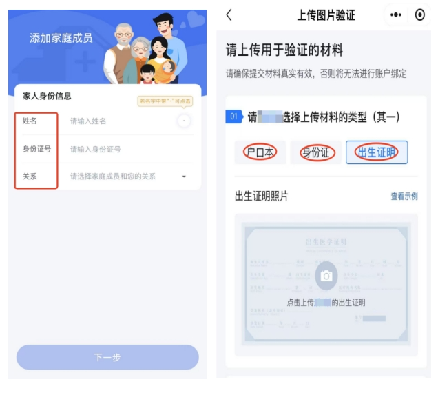 第四步:填写需绑定的家庭成员信息,上传验证材料(户口本、身份证、出生证明选其一)。