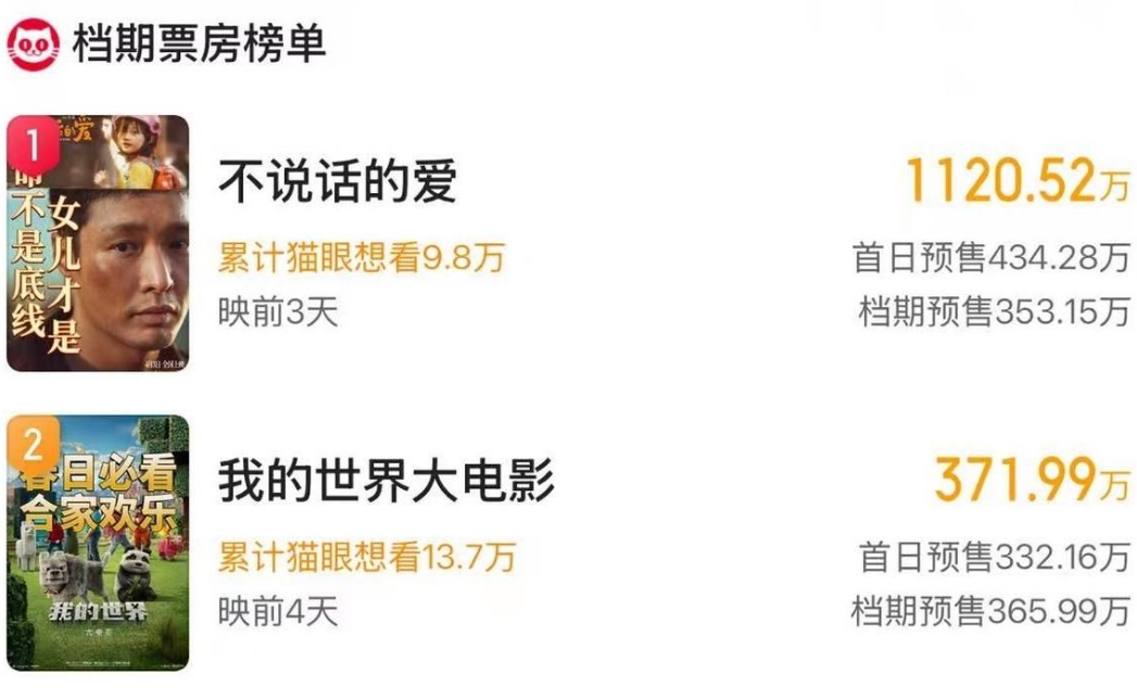据网络平台数据,截至2025年3月31日14时,2025年清明档新片预售总票房超2000万,《不说话的爱》《我的世界大电影》《热烈》暂列清明档新片票房榜前三位。