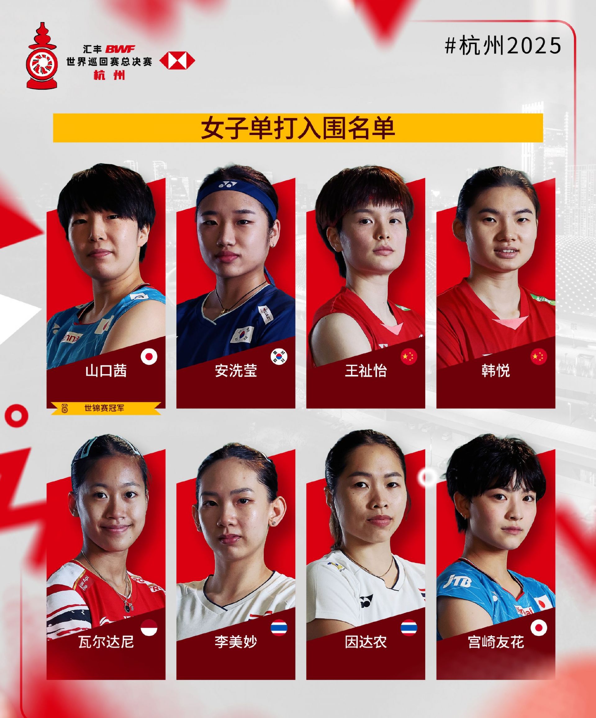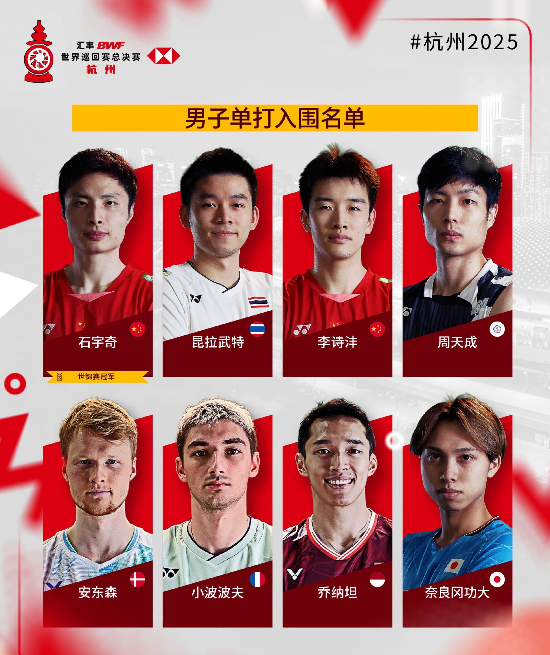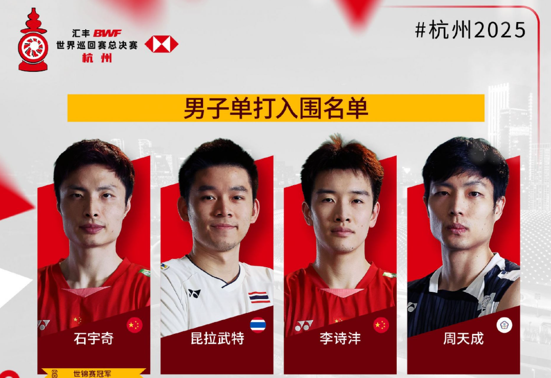 2025年世界羽联年终总决赛入围名单公布,比赛将于2025年12月17日至21日在杭州举行。各单项世锦赛冠军自动获得参赛资格。