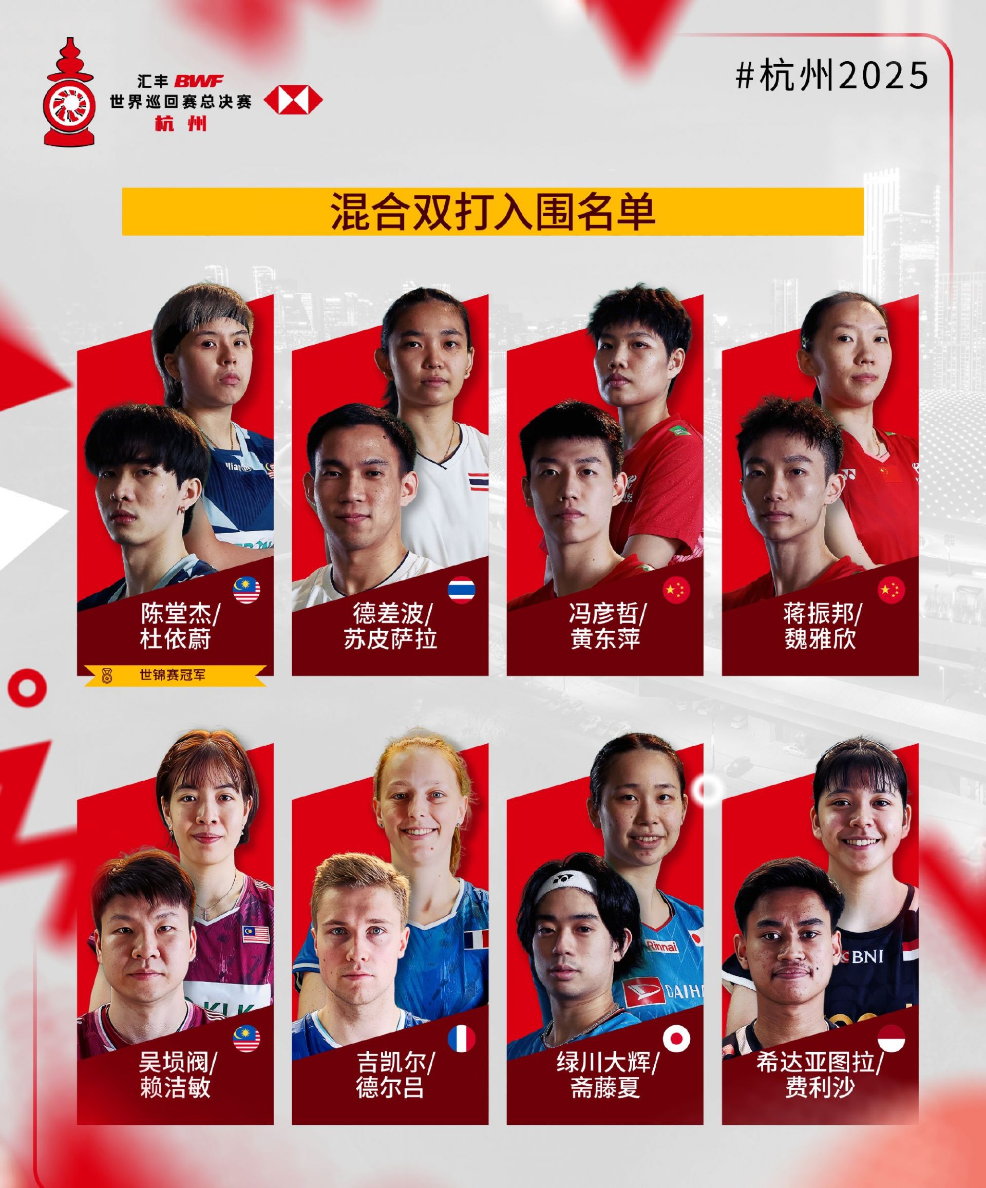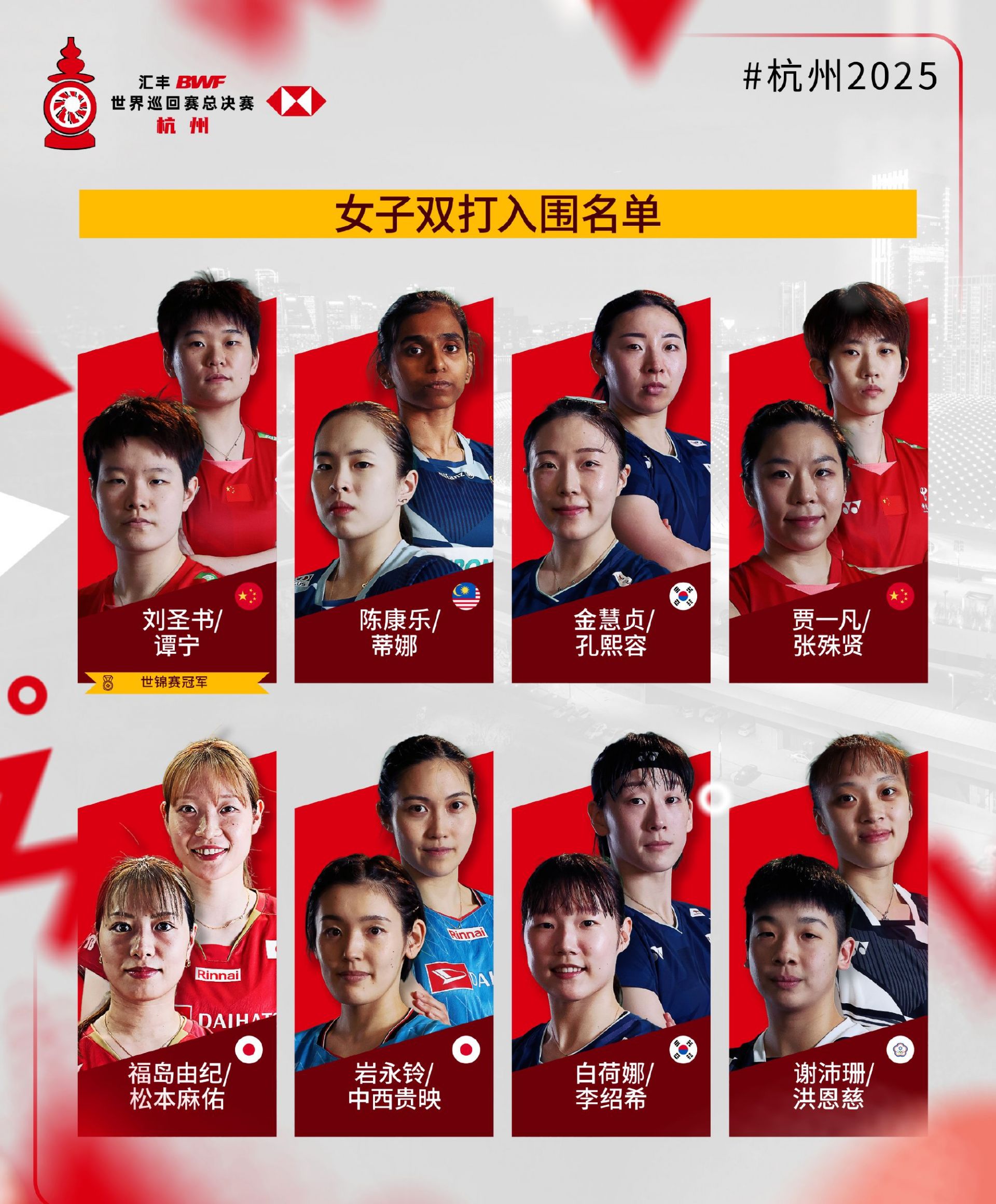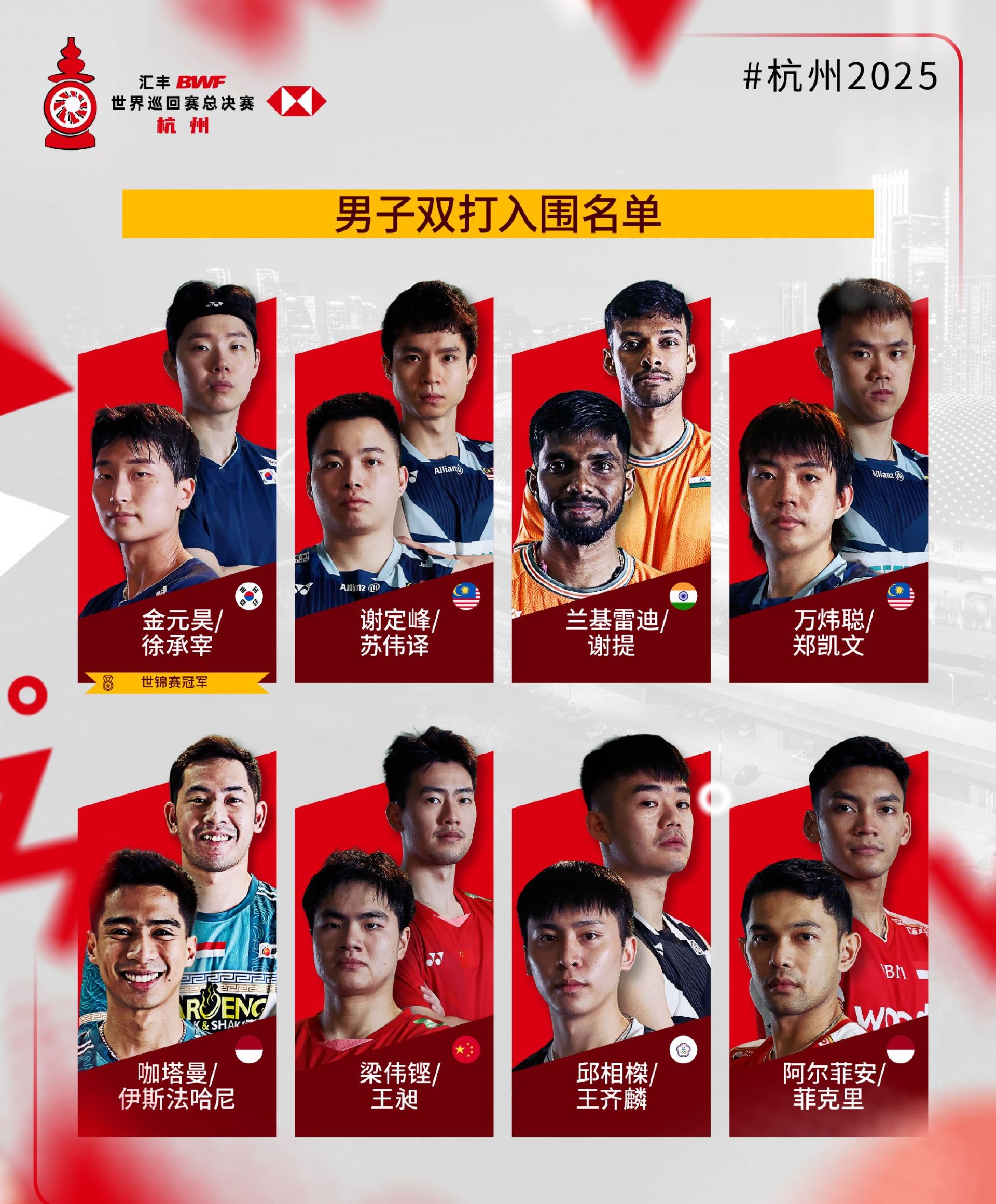 2025年世界羽联年终总决赛入围名单公布,比赛将于2025年12月17日至21日在杭州举行。各单项世锦赛冠军自动获得参赛资格。
