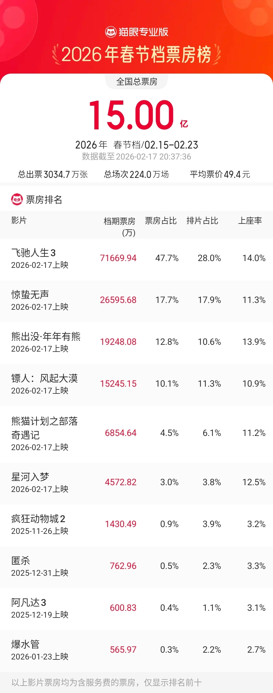 根据猫眼专业版数据,截至今晚20点37分,2026年春节档总票房(含预售)超15亿,《飞驰人生3》以超7.17亿的成绩暂时领跑今年春节档大盘;《惊蛰无声》位列第二,票房超2.66亿;《熊出没·年年有熊》和《镖人:风起大漠》位列第三、四位,累计票房也均已破亿。与此同时,2月17日大年初一的单日票房也已经超过了12.22亿,超出了此前的市场预期,单日总场次数超57万场,刷新中国影史大年初一单日场次数纪录。