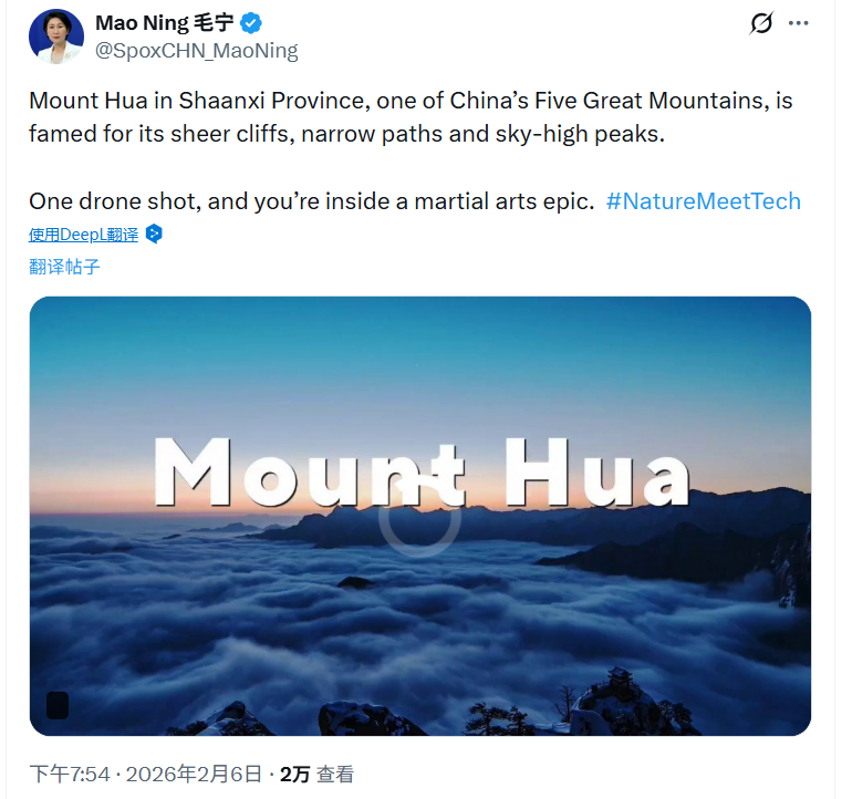 外交部发言人毛宁在国际社交平台向全球推介华山