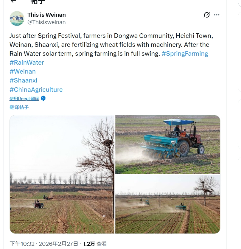 雨水节气过后,渭南各地田间地头陆续开始春耕备耕。农业机械在麦田中穿梭,小麦追肥作业有序展开,一幅现代农业生产的图景在海外平台同步呈现。