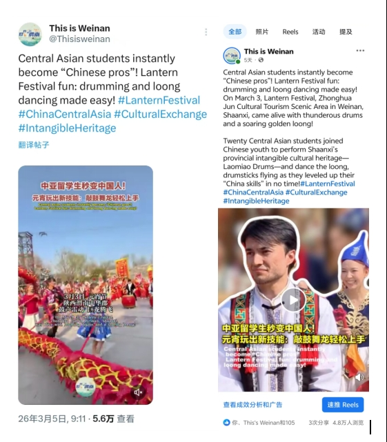 《鼓震元宵 龙舞丝路 中亚青年沉浸式“解锁”关中非遗》帖文