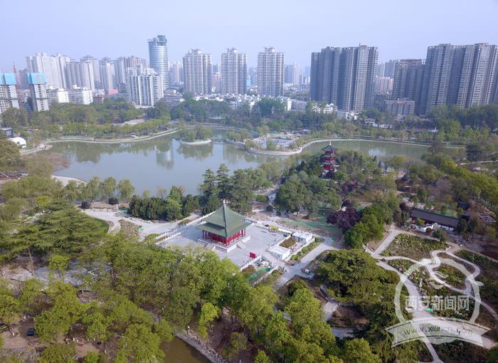 4月14日,从沉香亭角度无人机航拍的兴庆宫公园。为迎接第十四届全国运动会,我市对兴庆宫公园实施提升改造,主要包括遗址保护性展示,唐文化建筑修复、水体生态治理、园林绿化提升、游线体系提升、配套措施提升等内容,改造闭园期间为2020年12月25日至2021年6月30日。(西安报业全媒体记者 谢伟 摄)