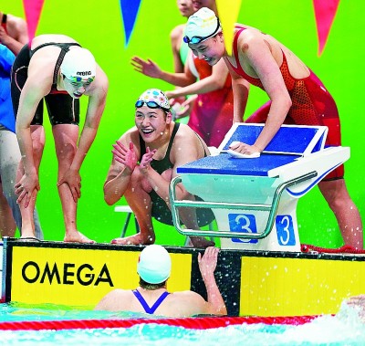 叶诗文与队友们获得女子4×200米混合泳金牌后在庆祝胜利。光明日报记者 陈城摄/光明图片