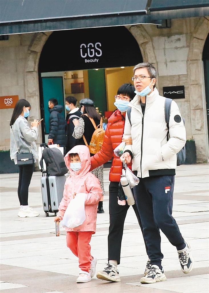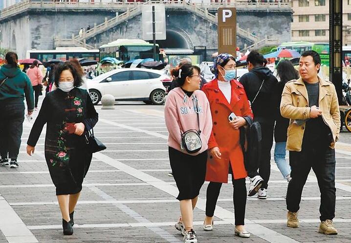 10月10日,受中等强度冷空气影响,西安气温骤降,市民、游客纷纷穿上棉衣御寒。(西安报业全媒体记者 尚洪涛 摄)