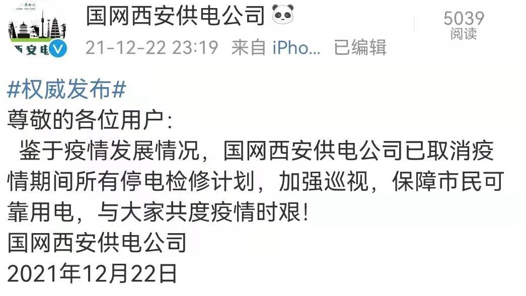 为此,记者联系了国网西安供电公司。对方回应,目前检修计划已经取消。鉴于疫情发展情况,国网西安供电公司已取消疫情期间所有停电检修计划,加强巡视,保障市民可靠用电,与大家共度疫情时艰!