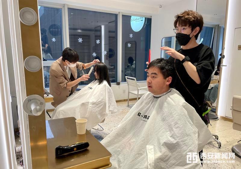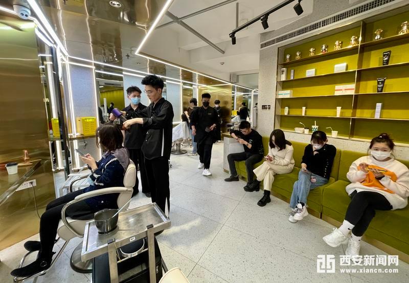 1月24日,高新大都荟的一家理发店内,等待理发的市民排起了长队。当日,西安市全市降为低风险地区,市民恢复正常出行,在家“宅”了近一个月后,对许多人来说修剪一下自己的发型,成了春节前的“头”等大事,让理发店迎来了客流高峰。(西安报业全媒体记者 王旭东 摄)