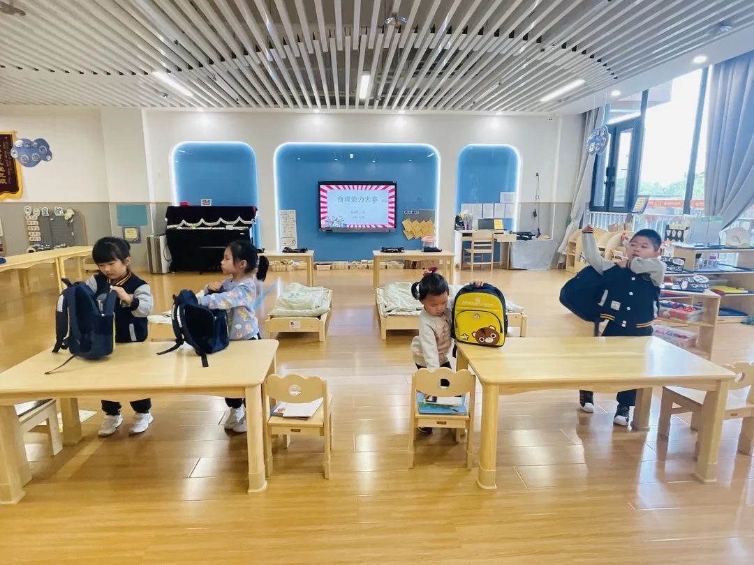 这场比赛按照年龄分为三个组进行。小班组的比赛项目包括:自己穿鞋、穿衣服扣纽扣、按照种类整理玩具。中班组的比赛项目有自己穿脱衣服、叠衣服、整理床铺。大班组的比赛项目更为“复杂”,除了扣扣子、叠衣服、整理床铺,还有整理小书包。