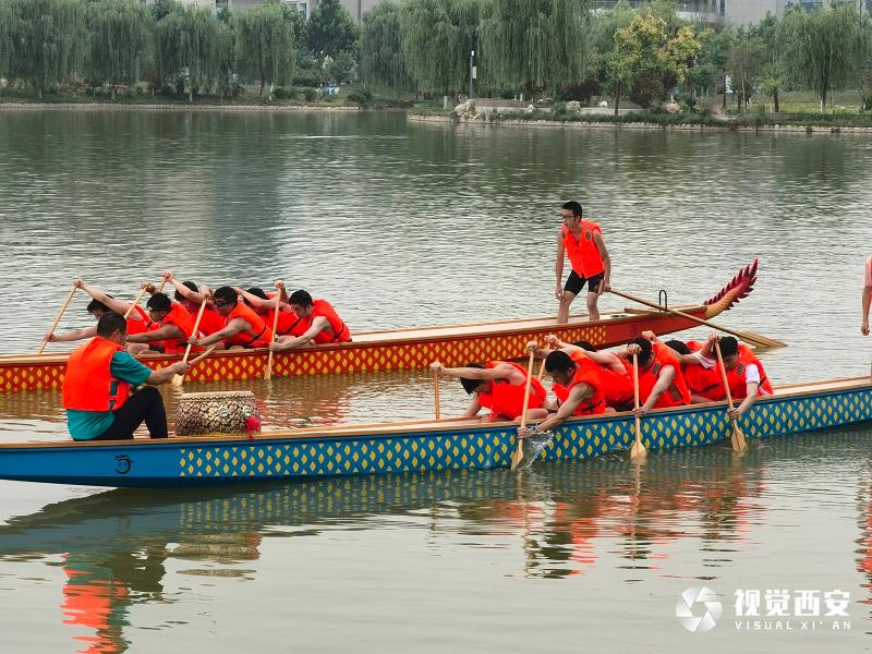 “咚咚咚”,随着有力的鼓点,一队大学生正在手持木浆练习着划船动作。不远处碧水盈盈的湖中,两只龙舟正在岸边等待着“开赛”。5月27日下午,在西北工业大学长安校区启翔湖畔,一堂龙舟体育课正在进行,与平时课堂上不同的是,一场赛龙舟也即将拉开帷幕。
