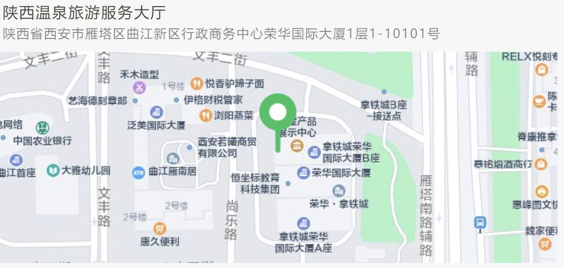 地址:西安市曲江新区行政商务中心荣华国际大厦一层1-10101号 陕西省温泉旅游服务大厅内14号窗口。营业时间:夏季时间,周一至周日 9:00-18:00;冬季时间,周一至周日 8:30-17:30 ; 周末及节假日正常营业。